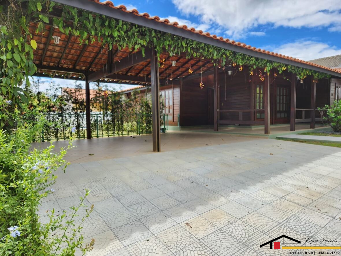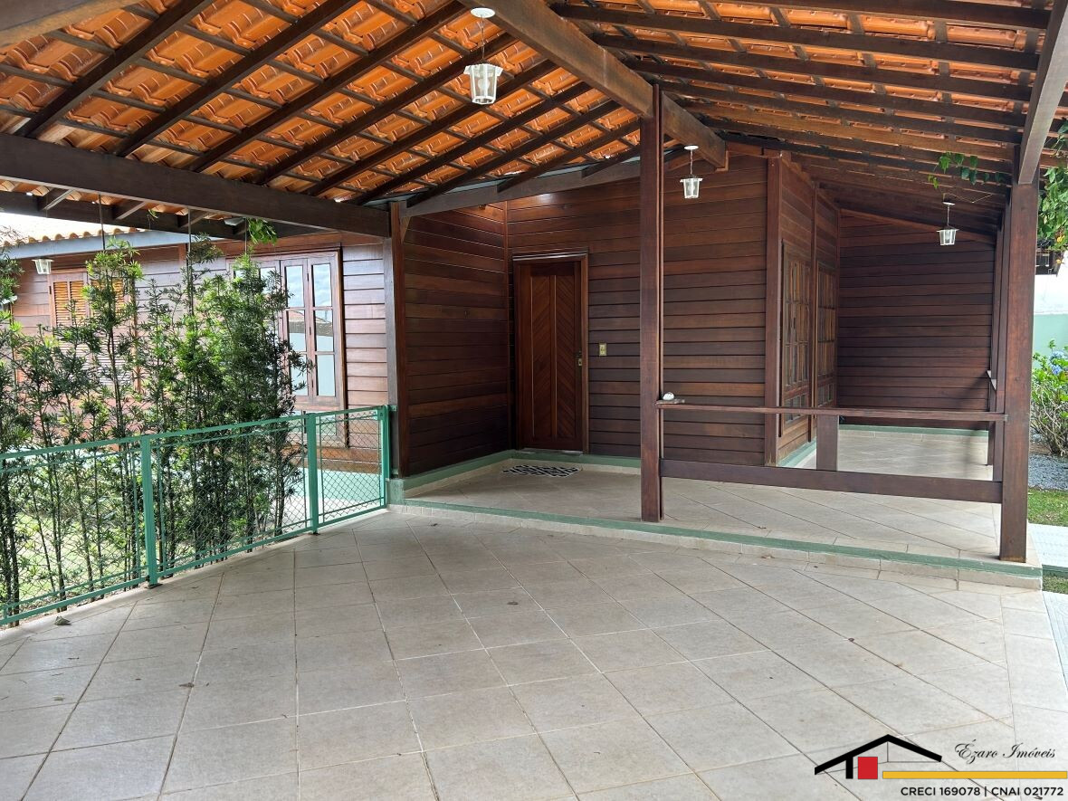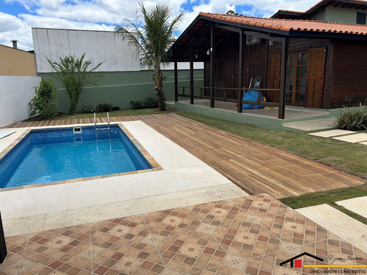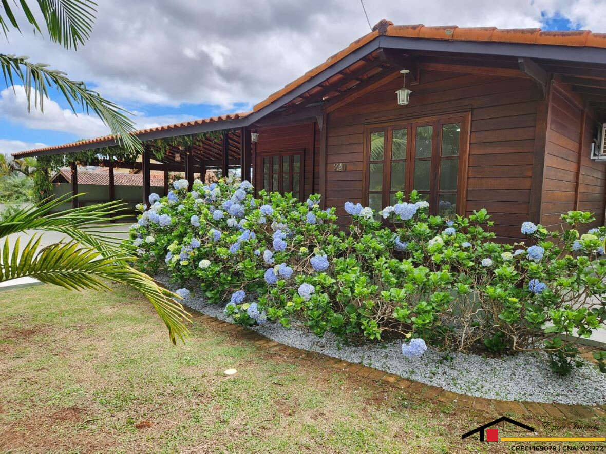 Casa de campo, Térrea em madeira, em 2 dois lotes: 3 quartos sendo uma suíte, todos com ar condicionado, sala de estar, jantar e sala de tv, cozinha com planejados. Area de lazer com muito espaço, churrasqueira, piscina, quintal. Garagem para 6 carros sendo 3 vagas cobertas. Casa frente a reserva, rua tranquila e espaçosa.