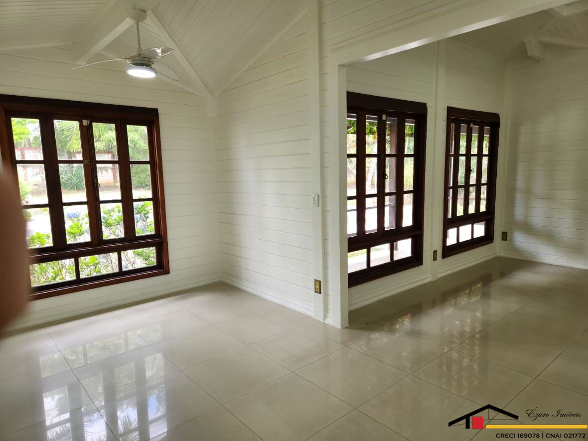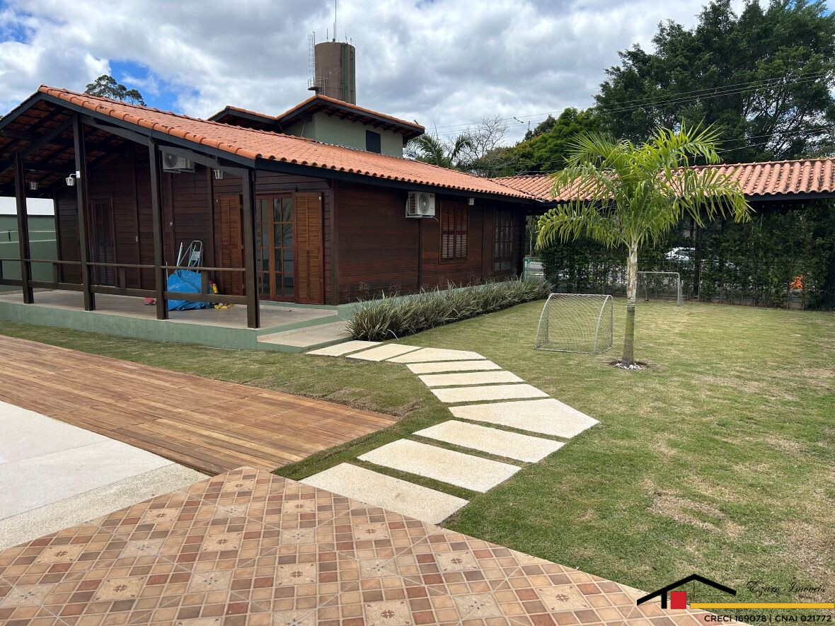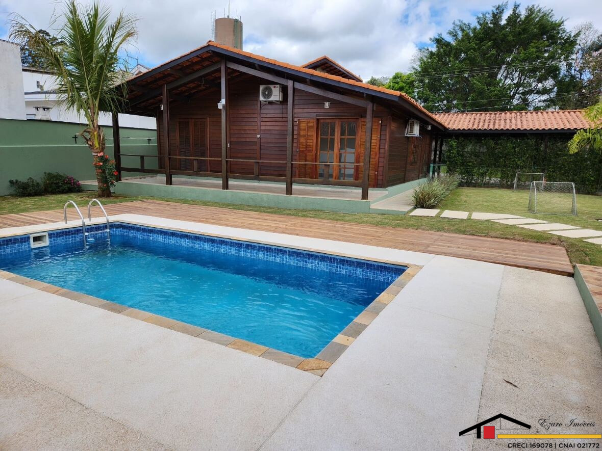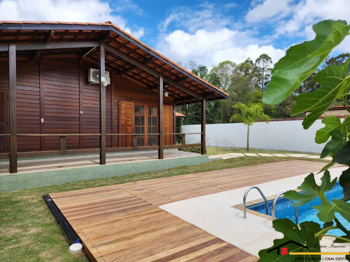 Casa de campo, Térrea em madeira, em 2 dois lotes: 3 quartos sendo uma suíte, todos com ar condicionado, sala de estar, jantar e sala de tv, cozinha com planejados. Area de lazer com muito espaço, churrasqueira, piscina, quintal. Garagem para 6 carros sendo 3 vagas cobertas. Casa frente a reserva, rua tranquila e espaçosa.