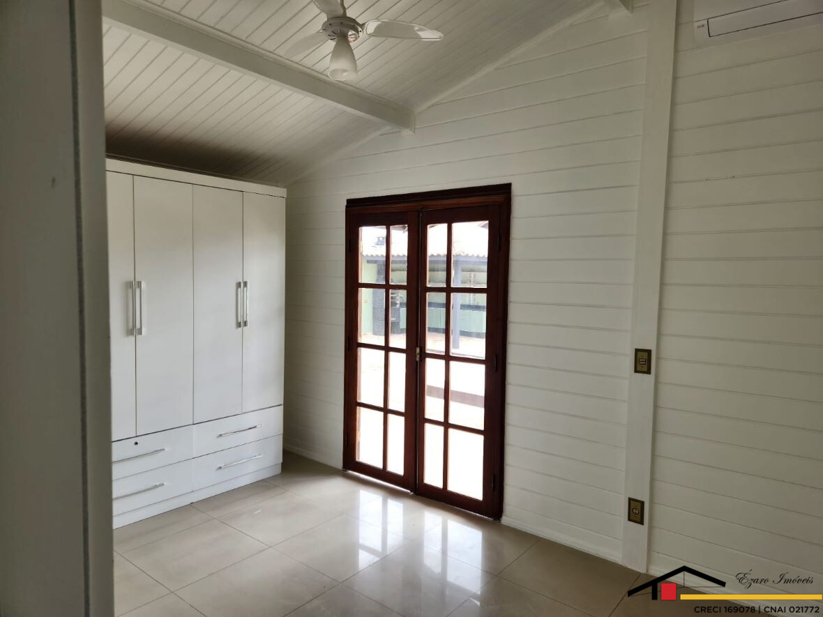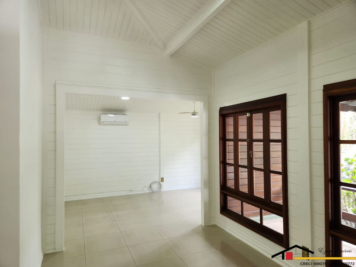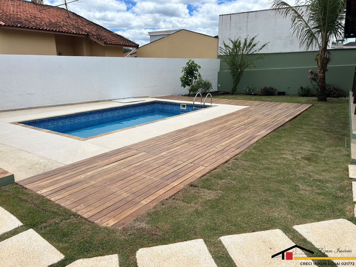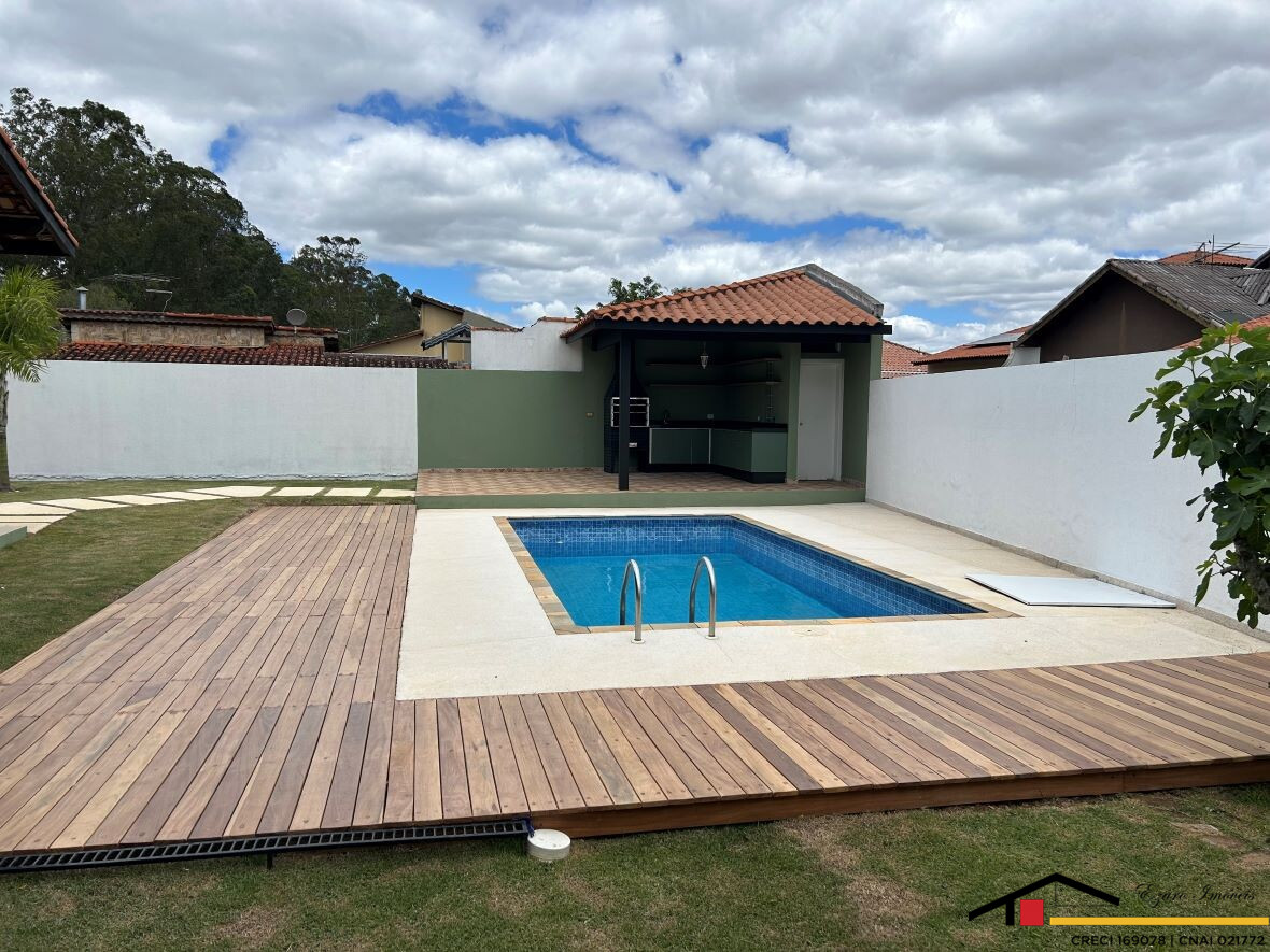 Casa de campo, Térrea em madeira, em 2 dois lotes: 3 quartos sendo uma suíte, todos com ar condicionado, sala de estar, jantar e sala de tv, cozinha com planejados. Area de lazer com muito espaço, churrasqueira, piscina, quintal. Garagem para 6 carros sendo 3 vagas cobertas. Casa frente a reserva, rua tranquila e espaçosa.