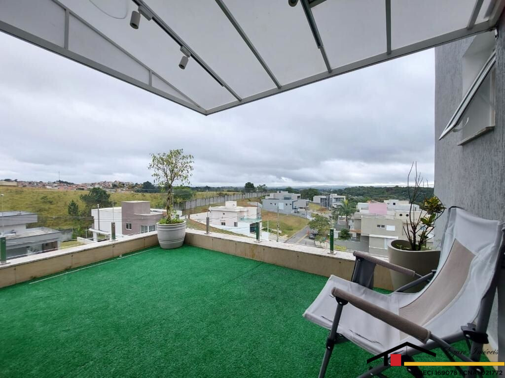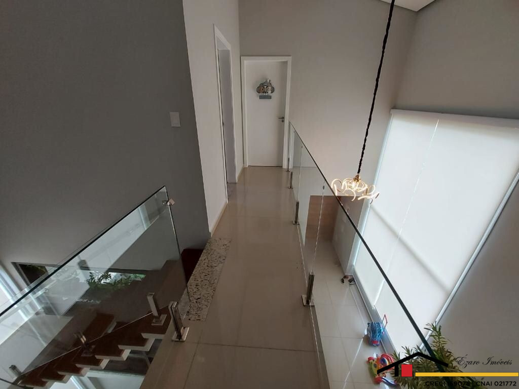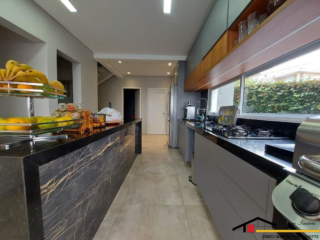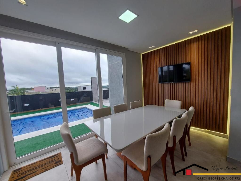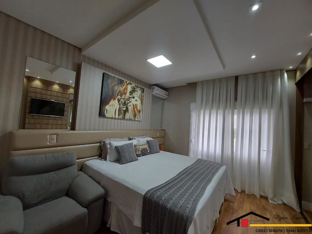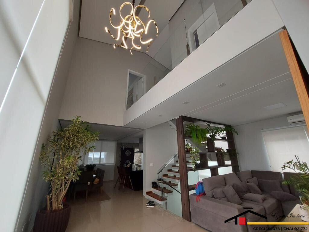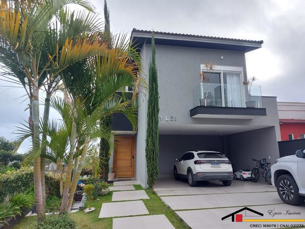 Sobrado localizado parte alta do Condomínio: 3 Qtos todos suítes, a máster com closet, hidromassagem, sacada com vista panorâmica, todos os quartos climatizados- Sala de estar com pé direito duplo, sala de tv climatizada, escritório-sala de jantar- cozinha com planejados. Área de lazer integrada a Área gourmet com, Sala privativa de TV, quarto, banheiro, piscina, sauna seca cozinha, churrasqueira elétrica. Garagem para 4 veículos, sendo 2 duas vagas cobertas.